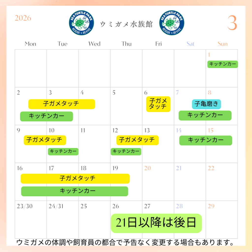 ウミガメ公園の2月/3月イベント一覧です!予約など詳細はご確認ください。3月21日以降は詳細決まり次第お知らせいたします。カレンダーの内容は予告なく変更になる場合もございます。ご了承ください。