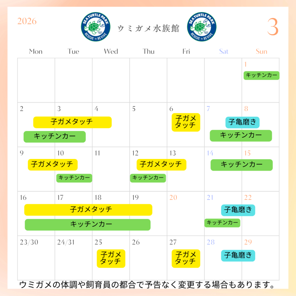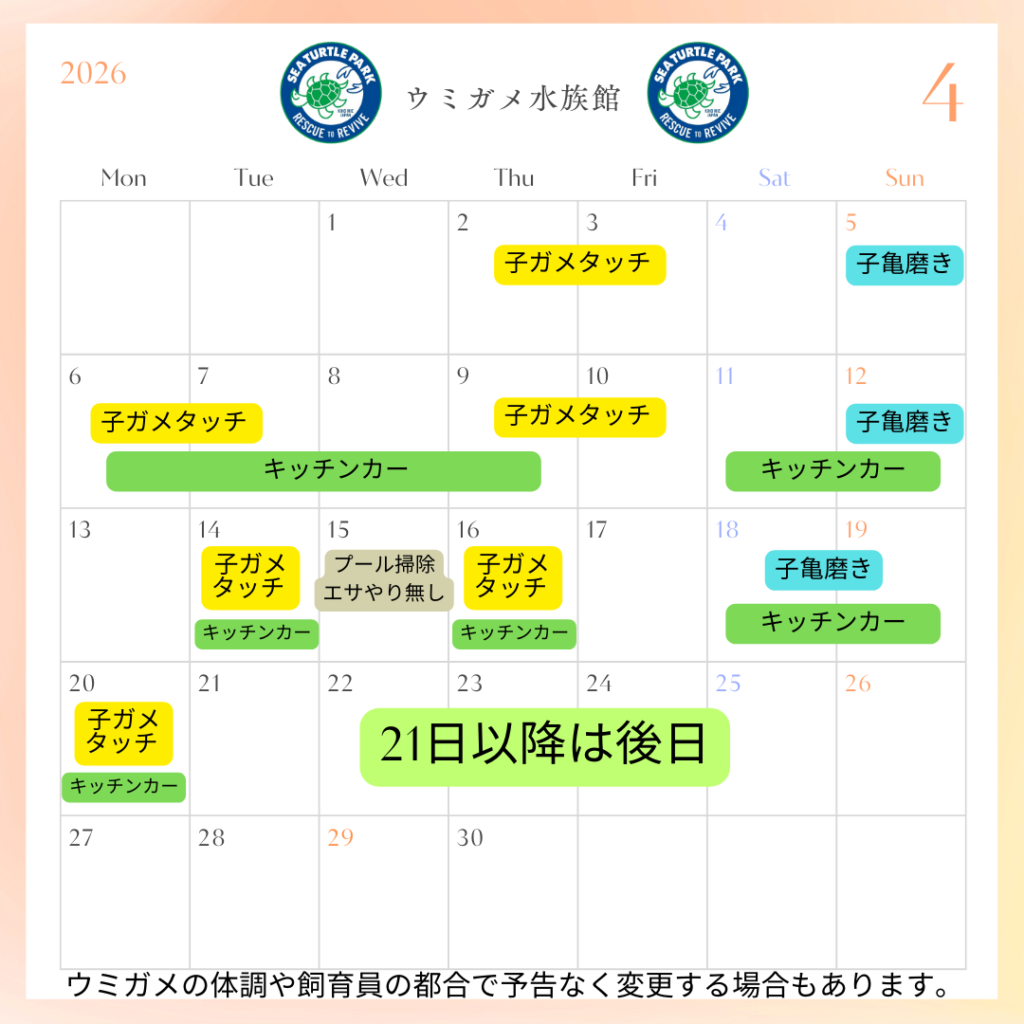 ウミガメ公園の3月/4月イベント一覧です!予約など詳細はご確認ください。4月21日以降は詳細決まり次第お知らせいたします。カレンダーの内容は予告なく変更になる場合もございます。ご了承ください。