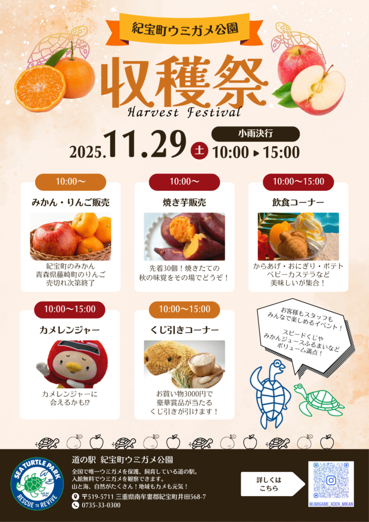 ウミガメ公園 イベント 2025年11月19日 ・11/29(土) ウミガメ公園 収穫祭2025 ・12/11(木) ウミガメ水族館 プール掃除 ・12/14(日) アサリフェスタ 出店参加 ・12/20(土) 紀宝町キラフェス 出店参加 ・12/3(水) きほう食堂 清掃メンテナンスのため1日お休みします。 詳細に関しては後日発表!いち早く確認したい方は公式Instagramをチェック!