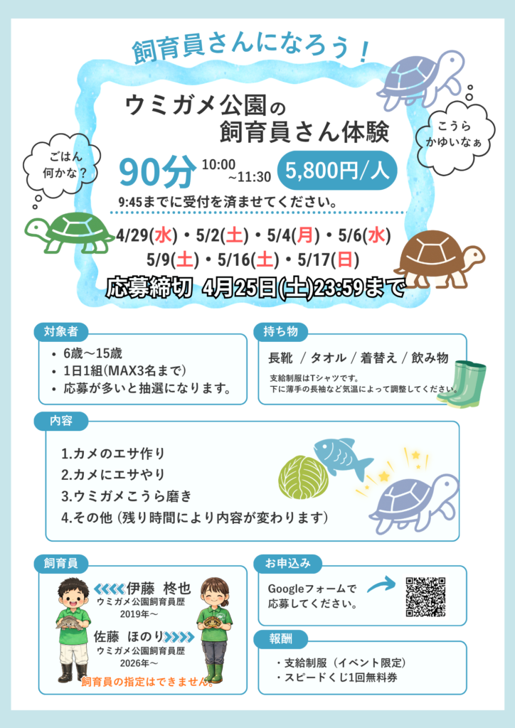 内容:飼育員さんと一緒にウミガメ公園のカメのお世話をしよう!